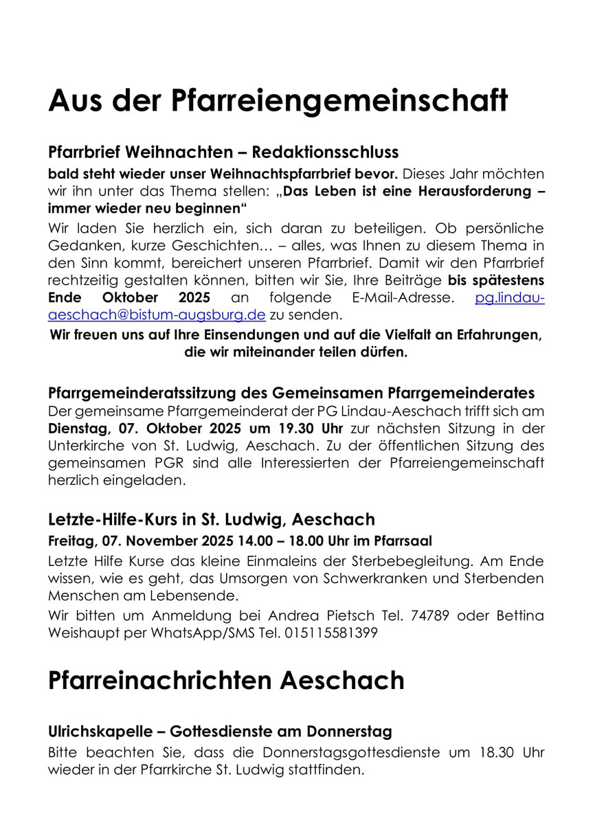 Wenn im Kirchenanzeiger "Ulrichskapelle" angegeben ist, findet der Gottesdienst in der "St. Ulrichskapelle" in Lindau-Aeschach statt.